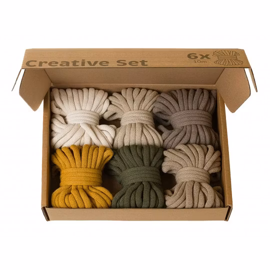 6 x 10 meter Jumbo Flätat Snöre 9 mm i jordnära färger: Terrakotta, Ockra, Skogsgrön, Naturvit, Sand, Kaffe,