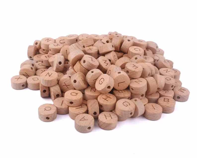 Träpärlor i obehandlat trä med ingraverade bokstäver.