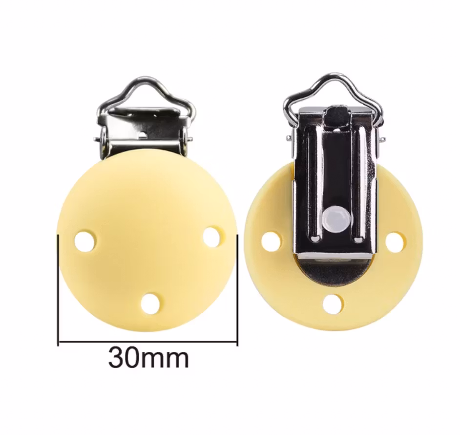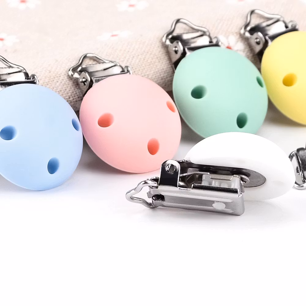 Runda hängselclips med hål i silikon till att göra nappsnöre eller barnvagnshänge!