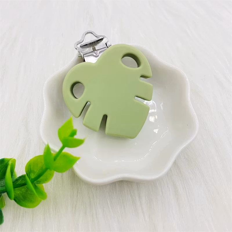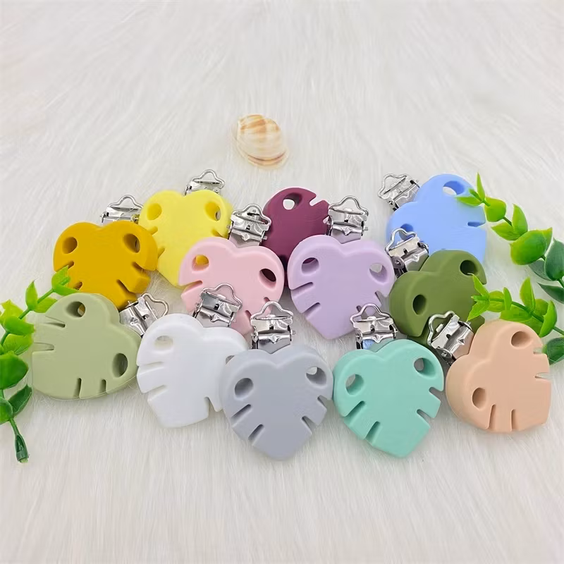 Hängselclips i silikon formade som blad till att göra nappsnöre eller barnvagnshänge!